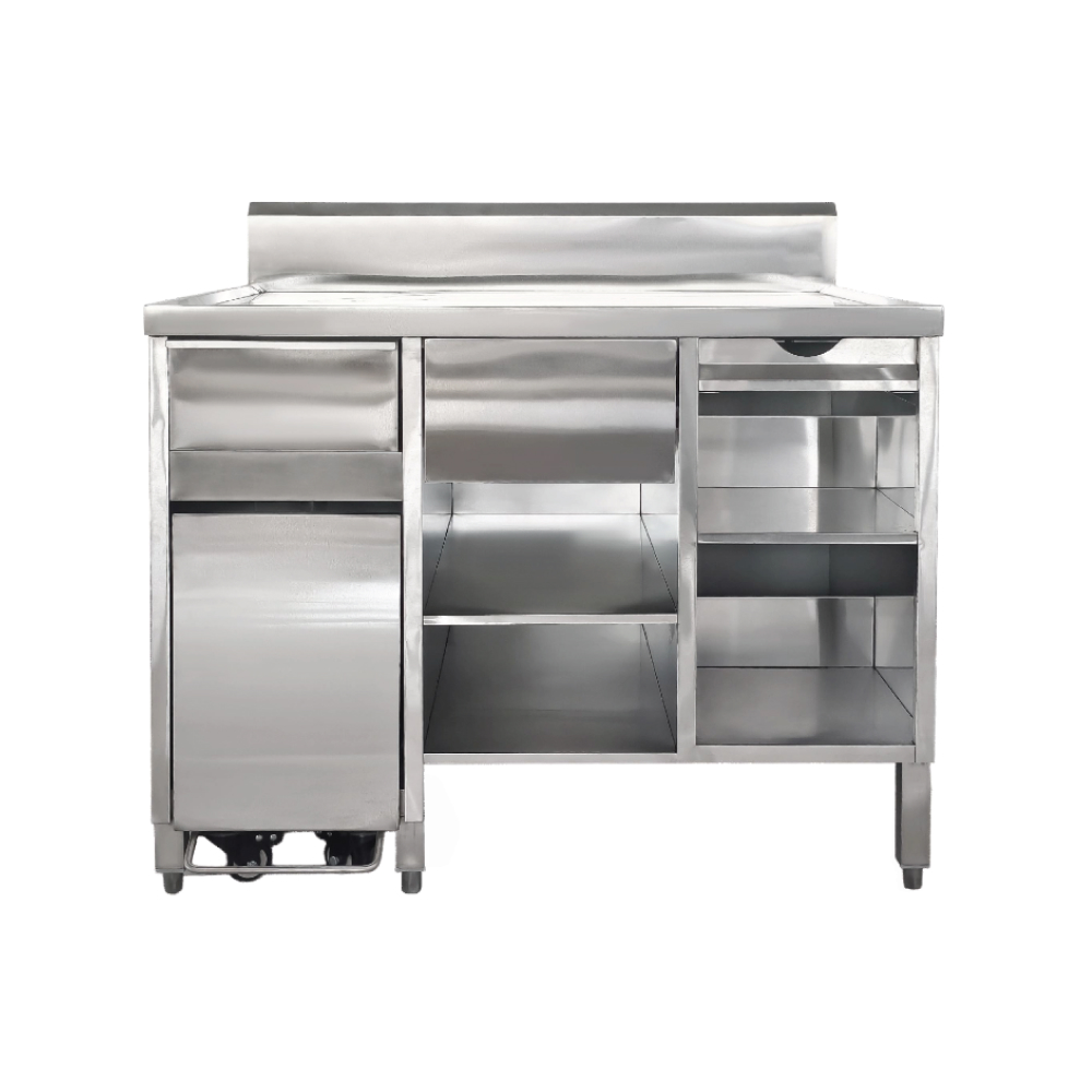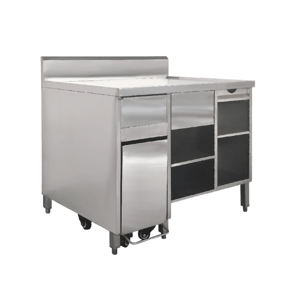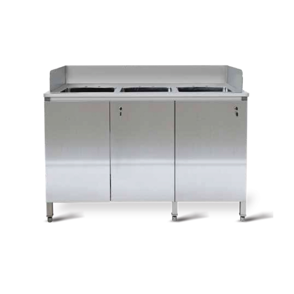 Work stations | Commercial cabinets | Ice bins | Hand sink | Hot water sink | Trash can cabinets | Rethermalizers | Storage racks | Commercial sinks